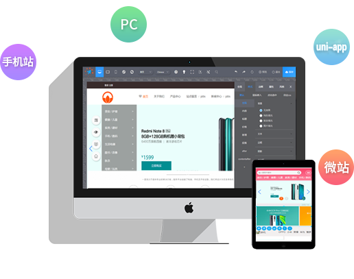 pc电脑站,手机站,公众号管理(微站),小程序多端统一数据,响应式的基础上也可以各端差异化。